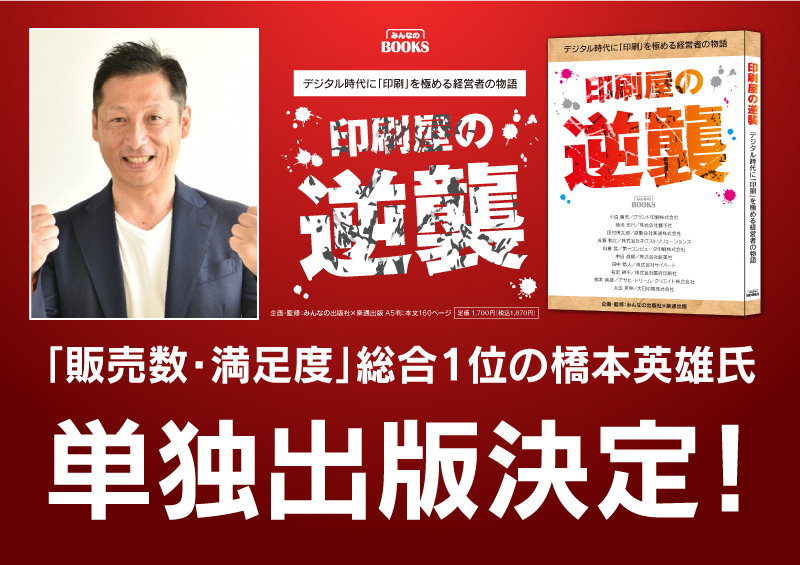 印刷屋の逆襲 デジタル時代に「印刷」を極める経営者の物語 みんなの出版社 1,700円(税別) デジタル全盛の今、「斜陽産業」といわれる「印刷業」。その中でも様々な工夫と挑戦をすることで未来を切り拓いてきた10名の経営者の生き方を描いた一冊。 彼らの姿はまさに「印刷屋の逆襲」だ。(※あえて「印刷屋」とタイトル化) 「勝手に提案企画」「サービス3倍プロジェクト」「企業映画化ポスター」「パンフレット制作王国」など、本書には様々な成功事例と、そのサービスが生まれた物語を記載しており、印刷会社経営者にとってはヒントの宝庫である! また、彼らはいきなり成功したわけではない。何度も失敗を経験しながら、ようやく「未来」を手に入れたのだ。 印刷会社経営者はもちろん、停滞気味の業界で戦っている全ての経営者にお読みいただきたい、「挑戦する勇気」が沸いてくる一冊。 |